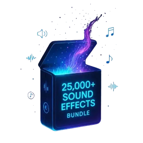 You get over 25,000 high-quality sound effects across 8 categories: Cinematic Hits, Ambience & Atmospheres, Foley & Real World, Transitions & Whooshes, Game & UI Sounds, Nature & Wildlife, Urban & City, and Electronic & Synth sounds. All files are provided in both WAV (48kHz/24-bit) and MP3 formats.